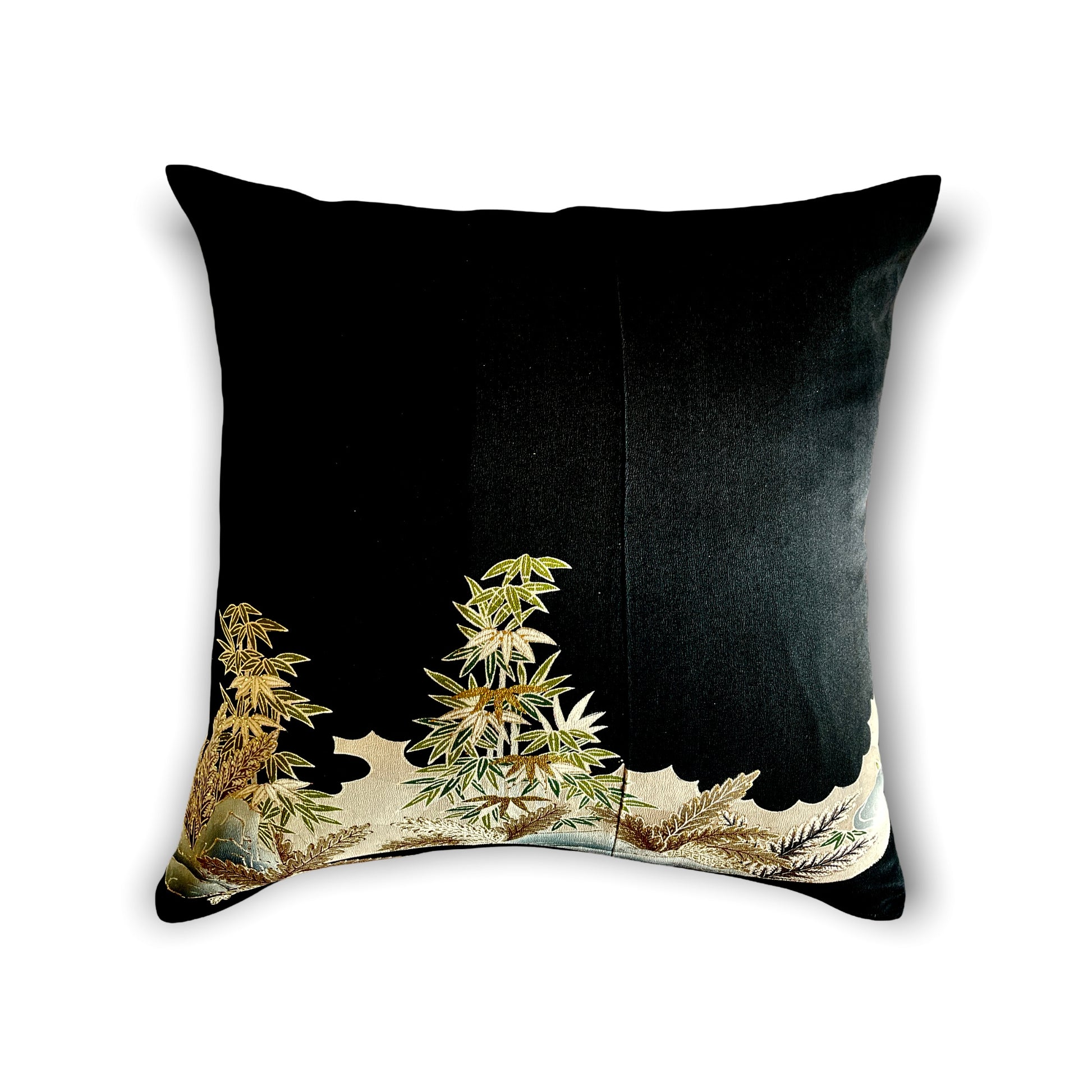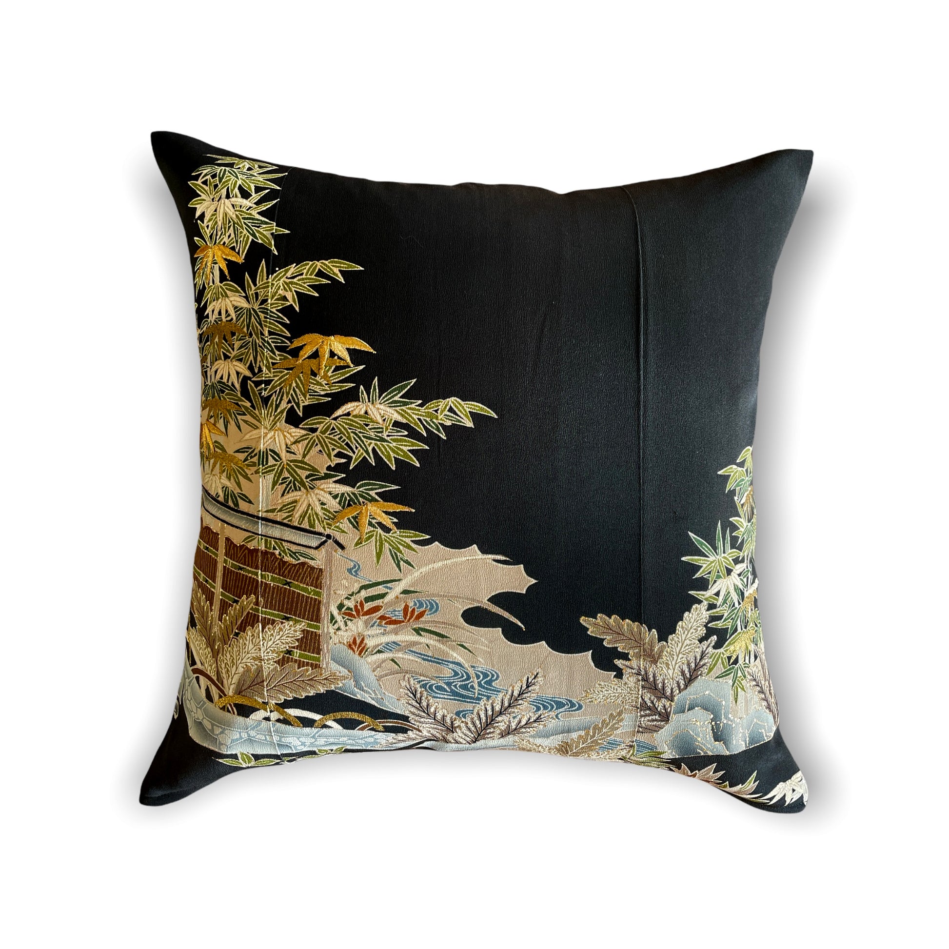 垣根をあしらった垣文様は古典文様で、風景と併せて描かれます。 こちらは柴垣に竹や流水、花なども書かれておりますが、竹の葉は金糸で刺繍されている部分もあり、派手さはないですが穏やかな景色に華を添えています。 やはり刺繍が入ると格が上がる感じがあります!