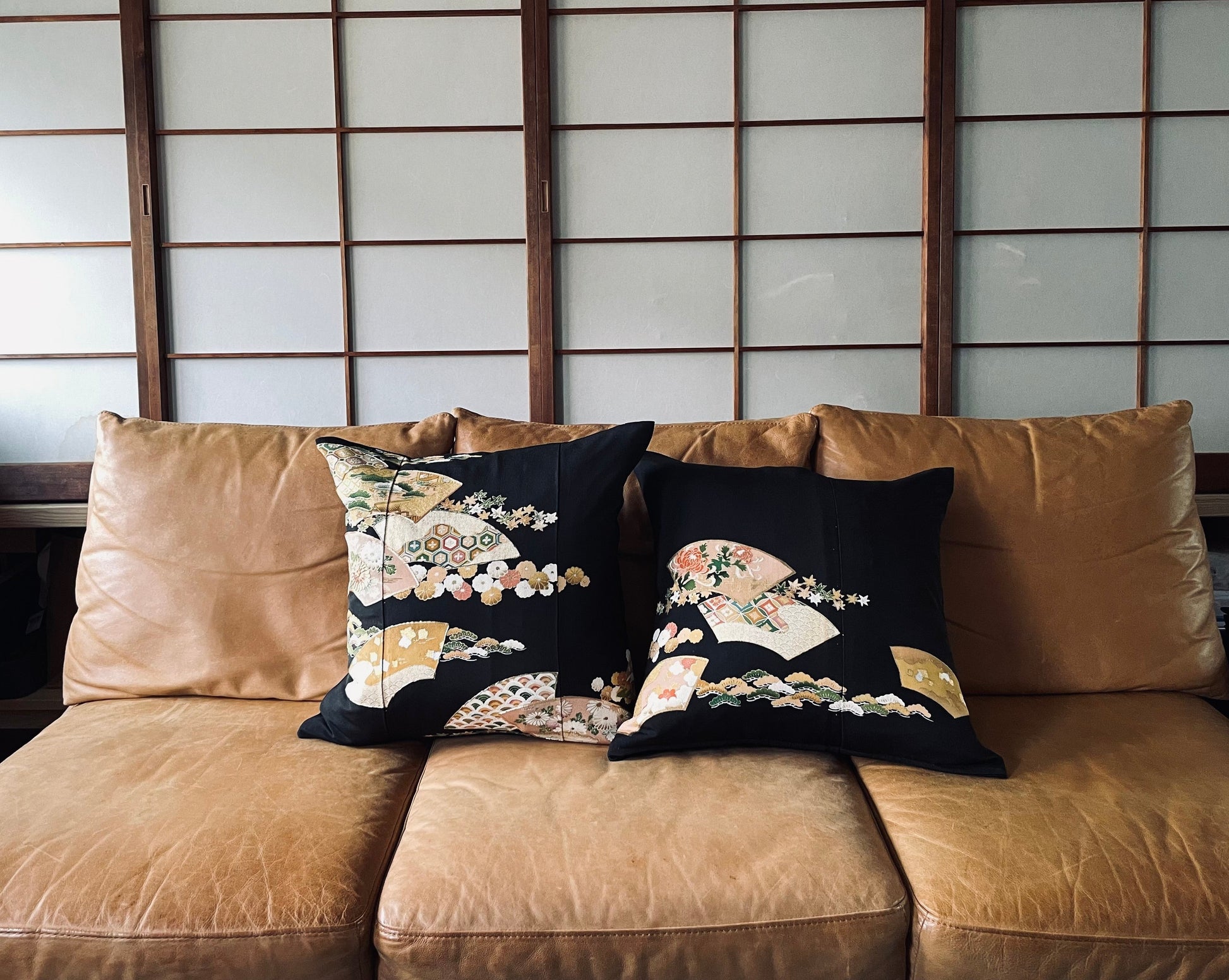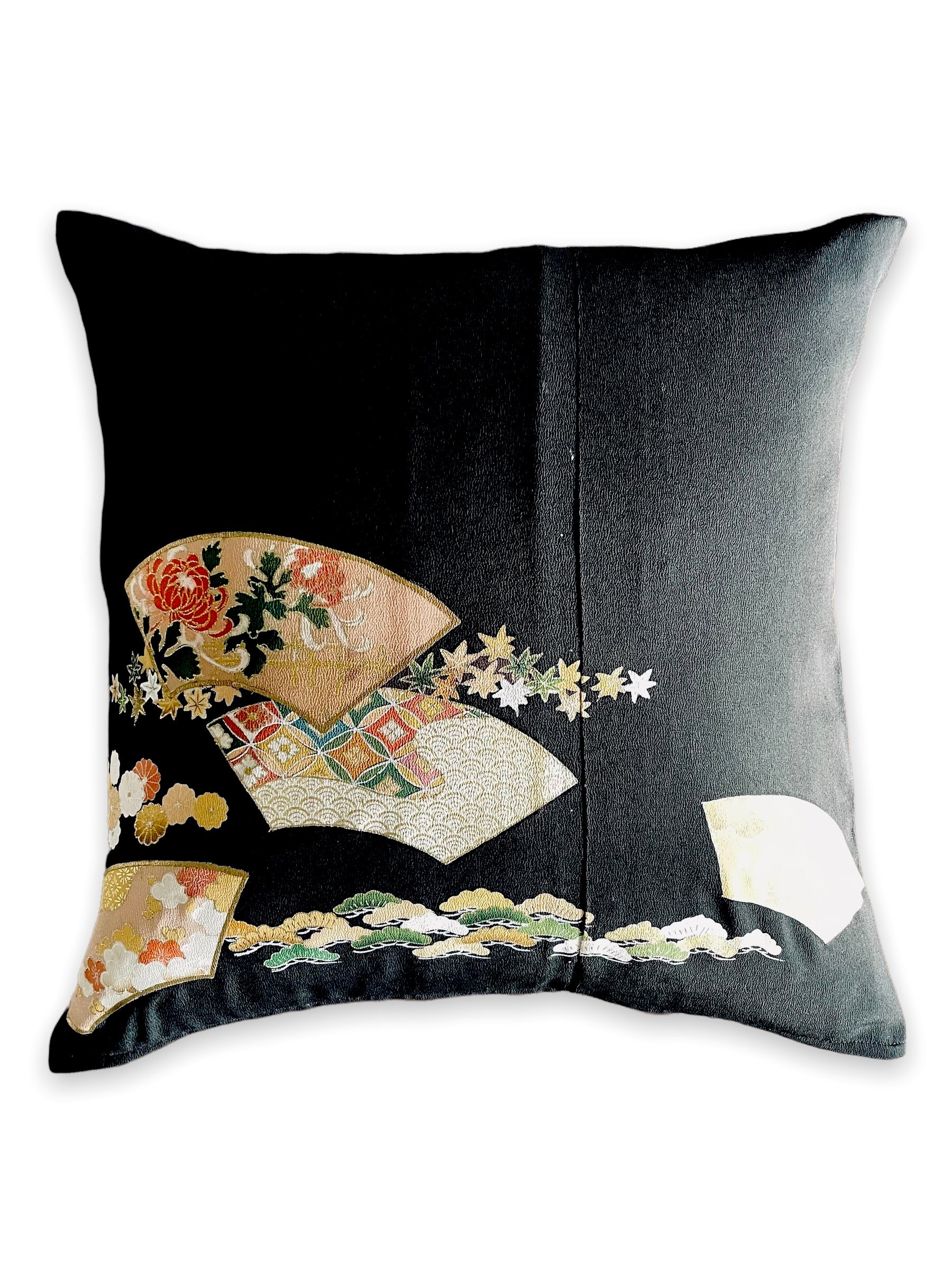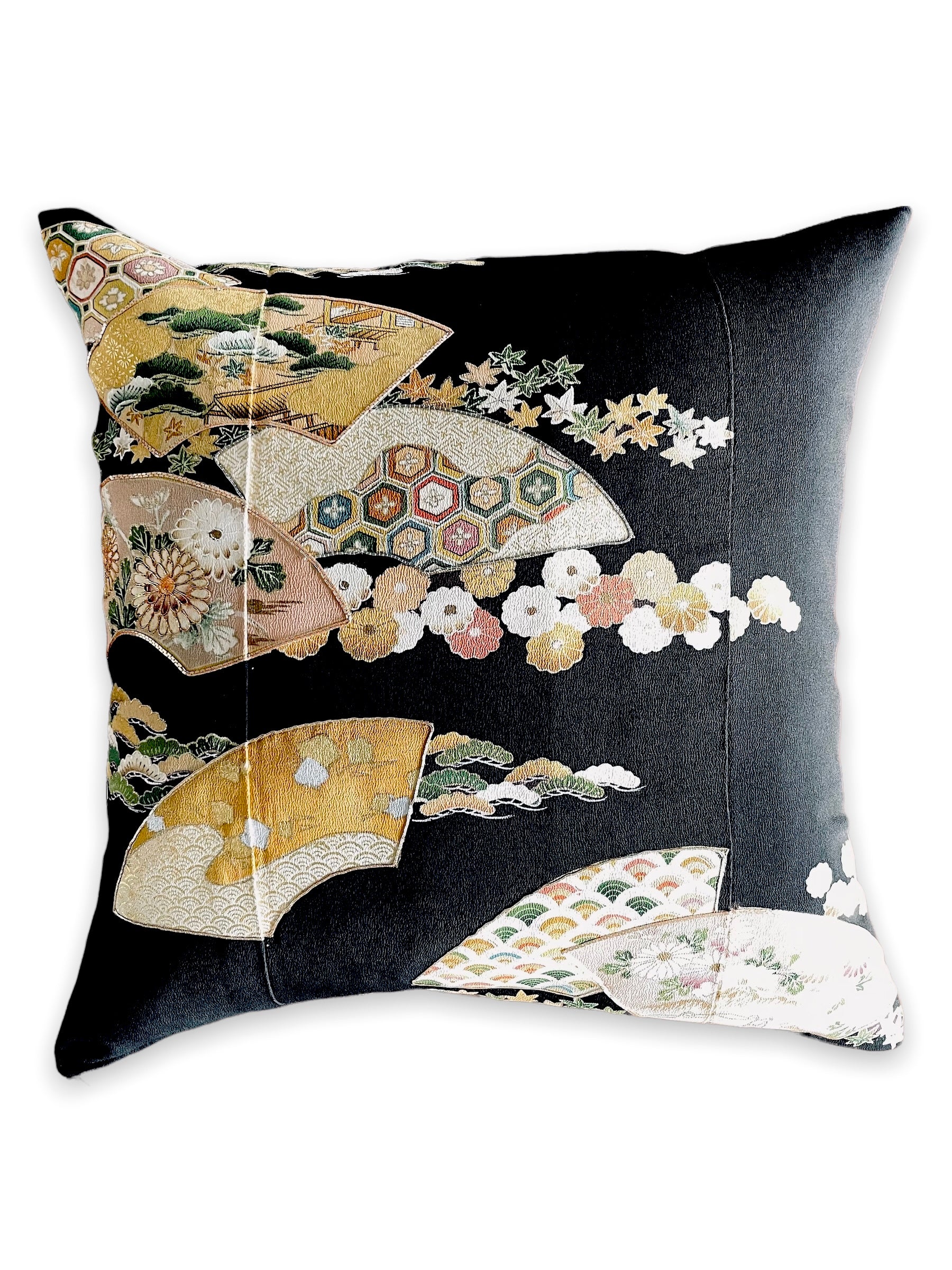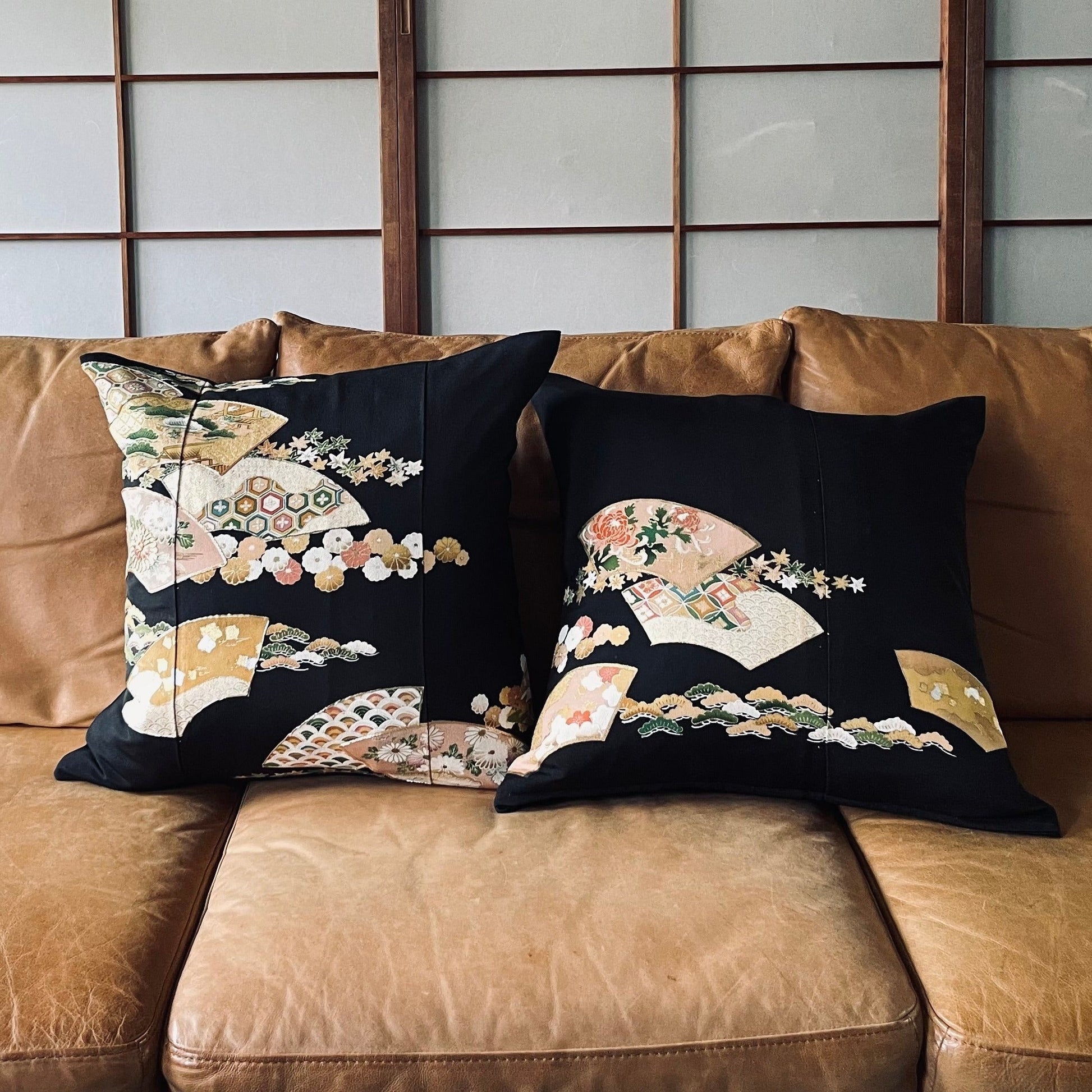 黒留【扇子を中心とした吉祥文様】アンティーク クッション(2個/セット)