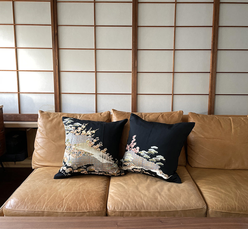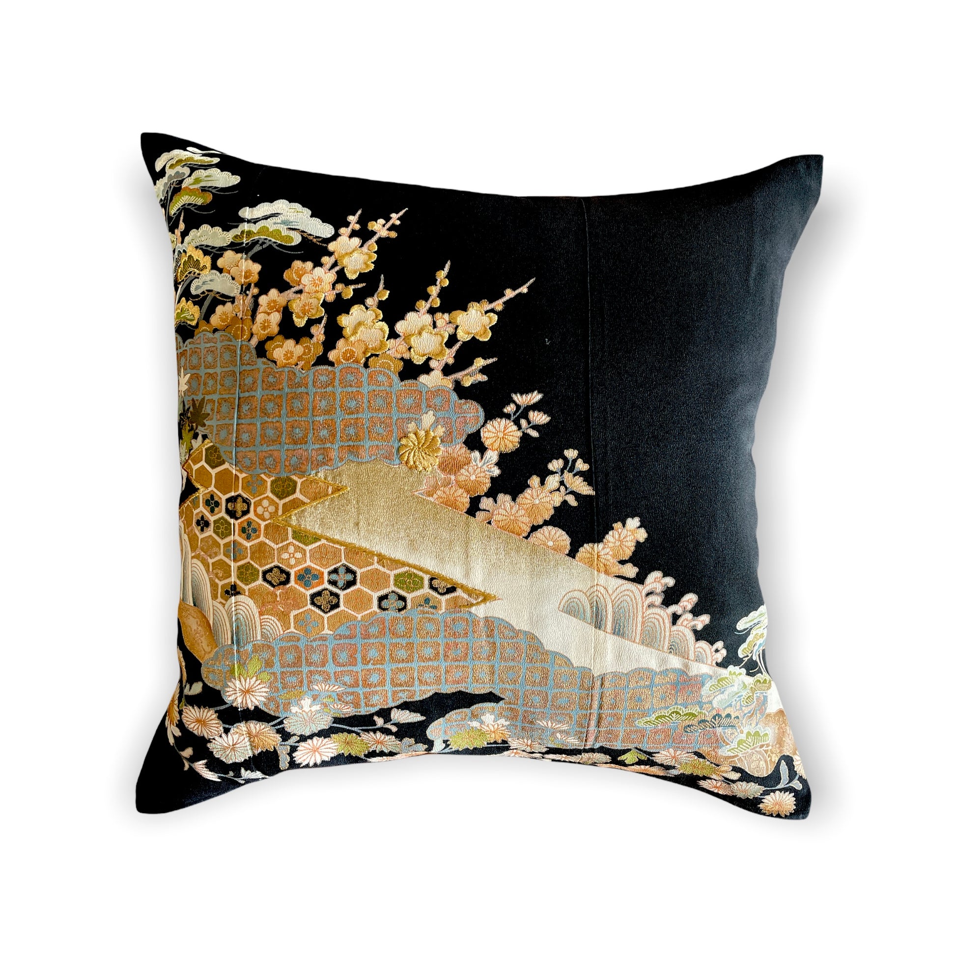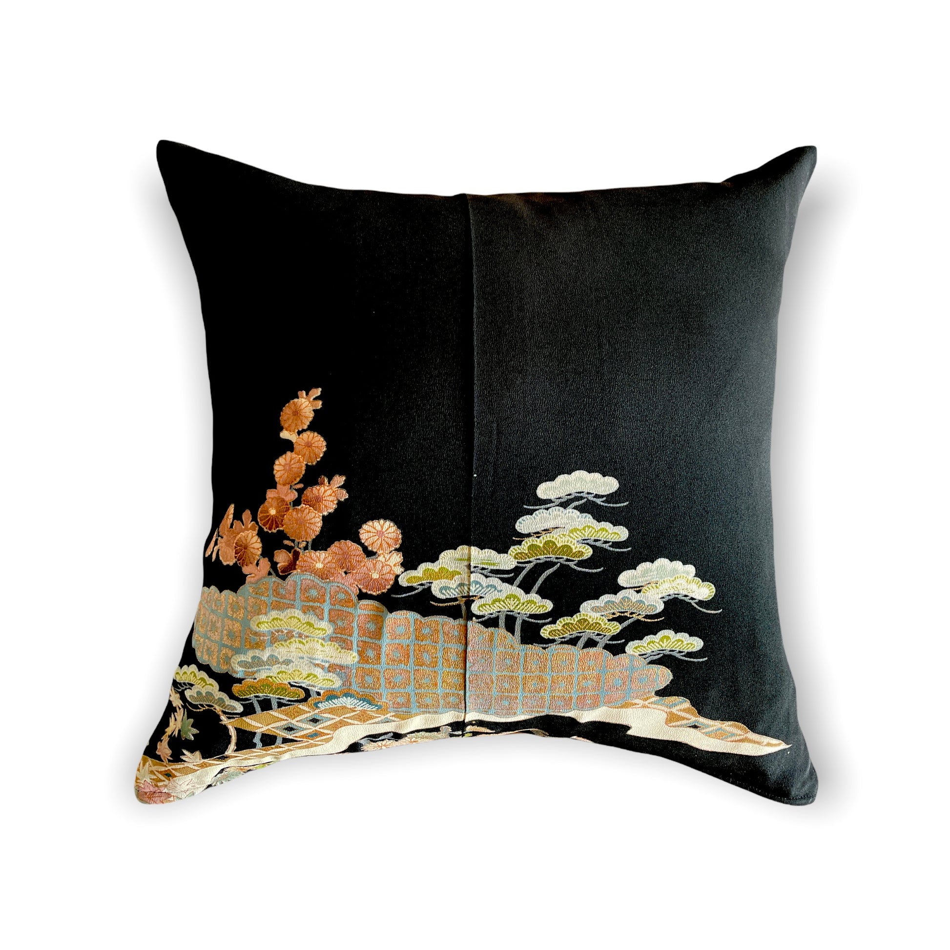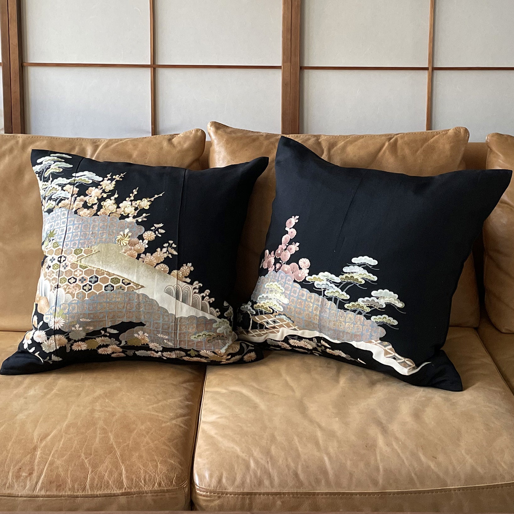 黒留【梅、松、吉祥文様】アンティーク クッション(2個/セット)