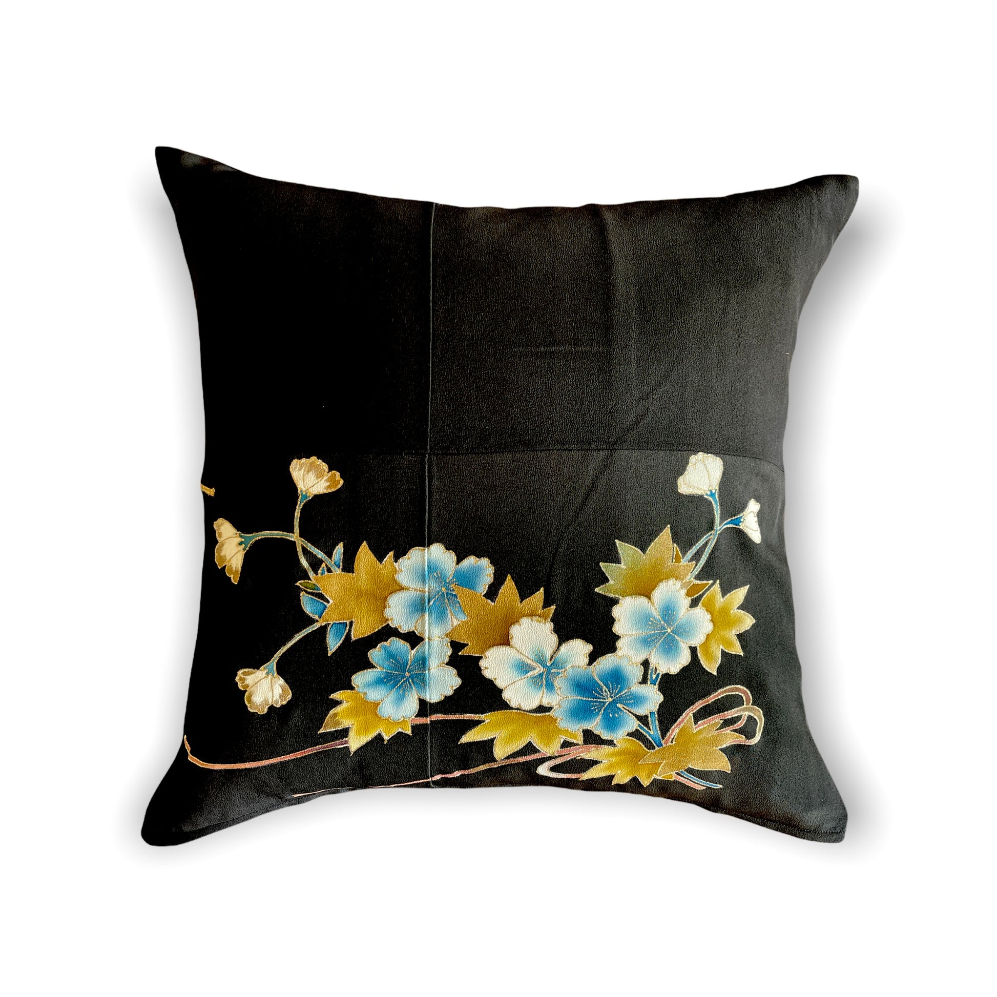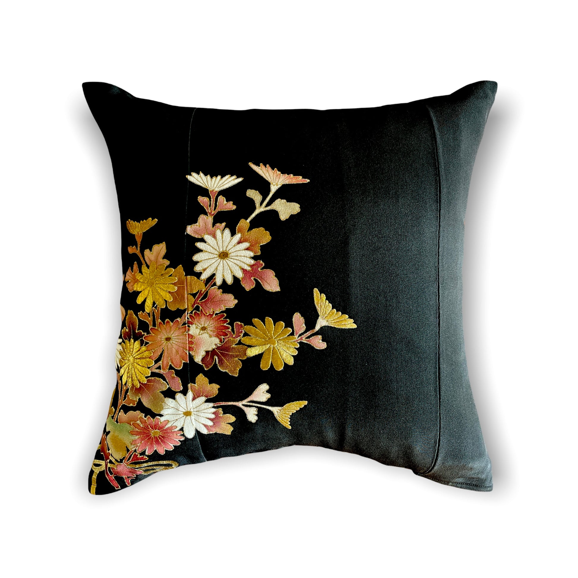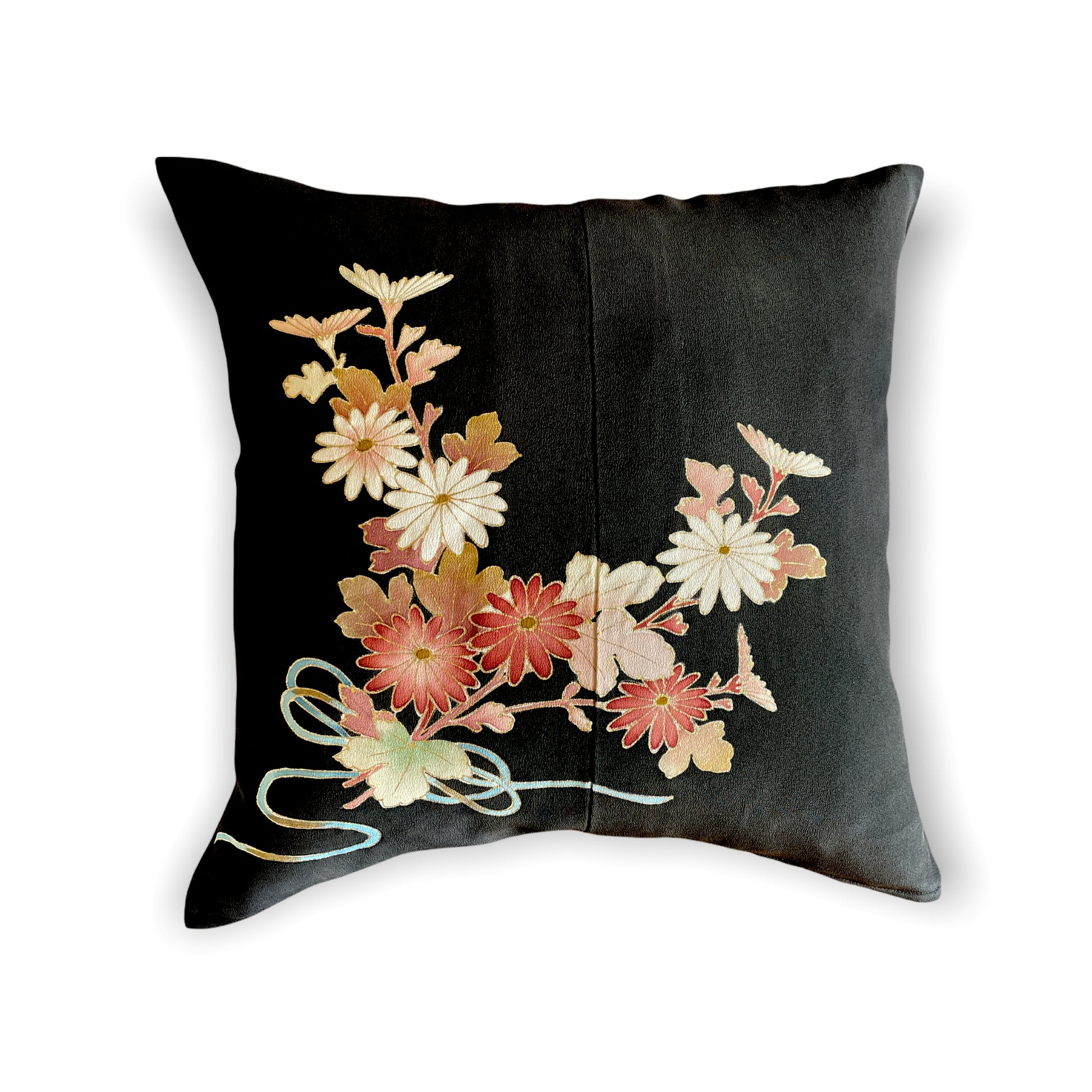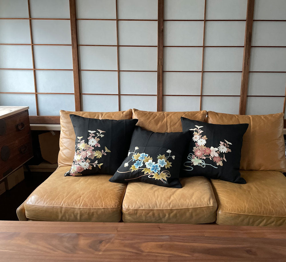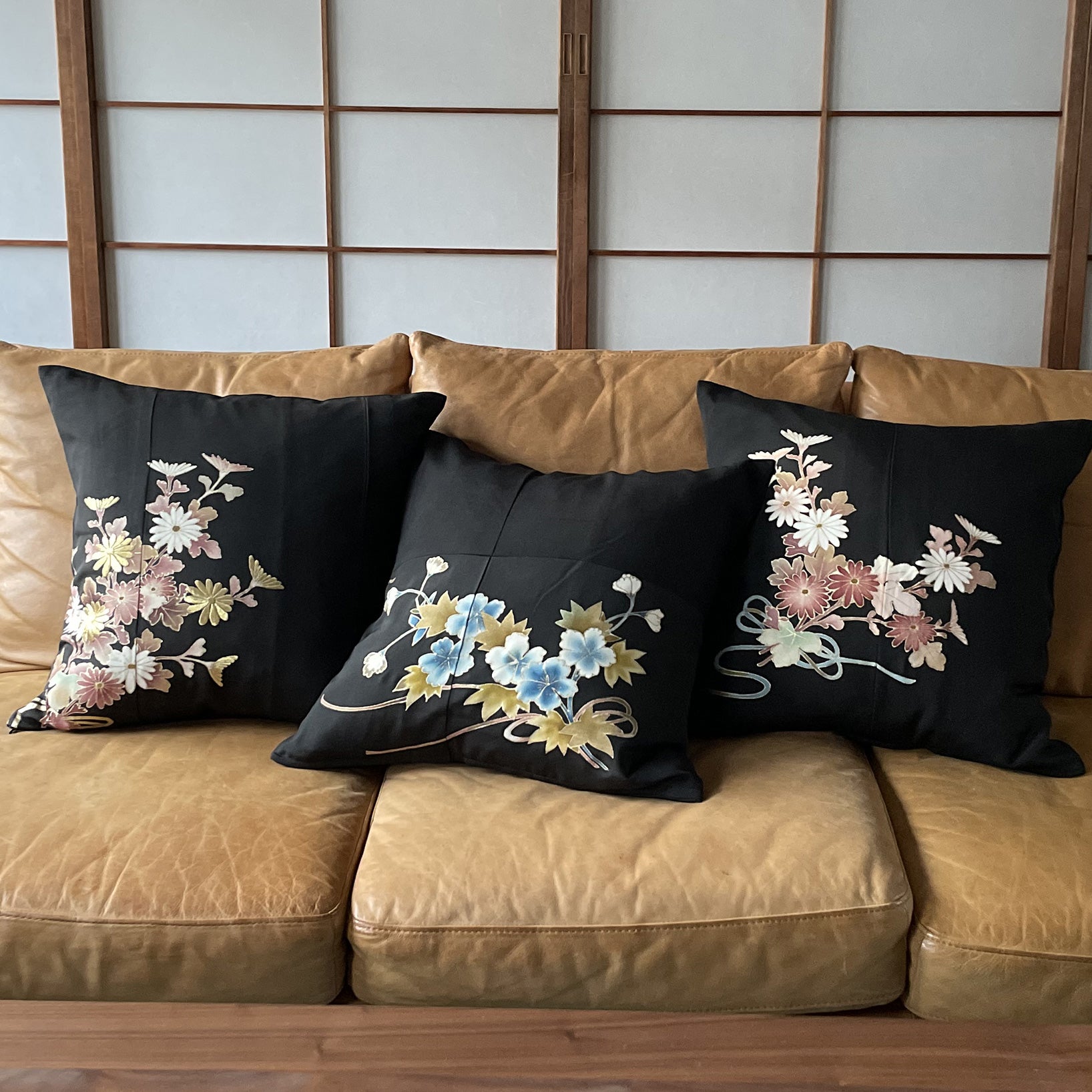 黒留【枝菊文様】アンティーク クッション(3個/セット)
