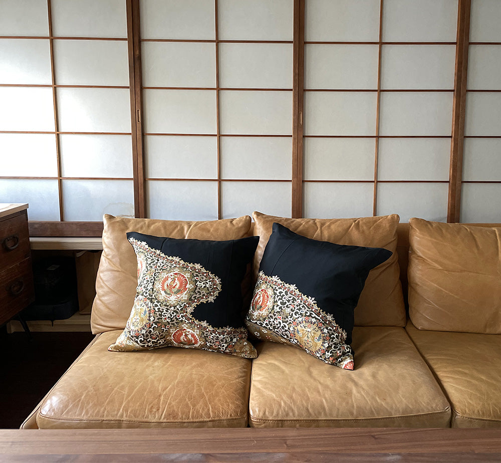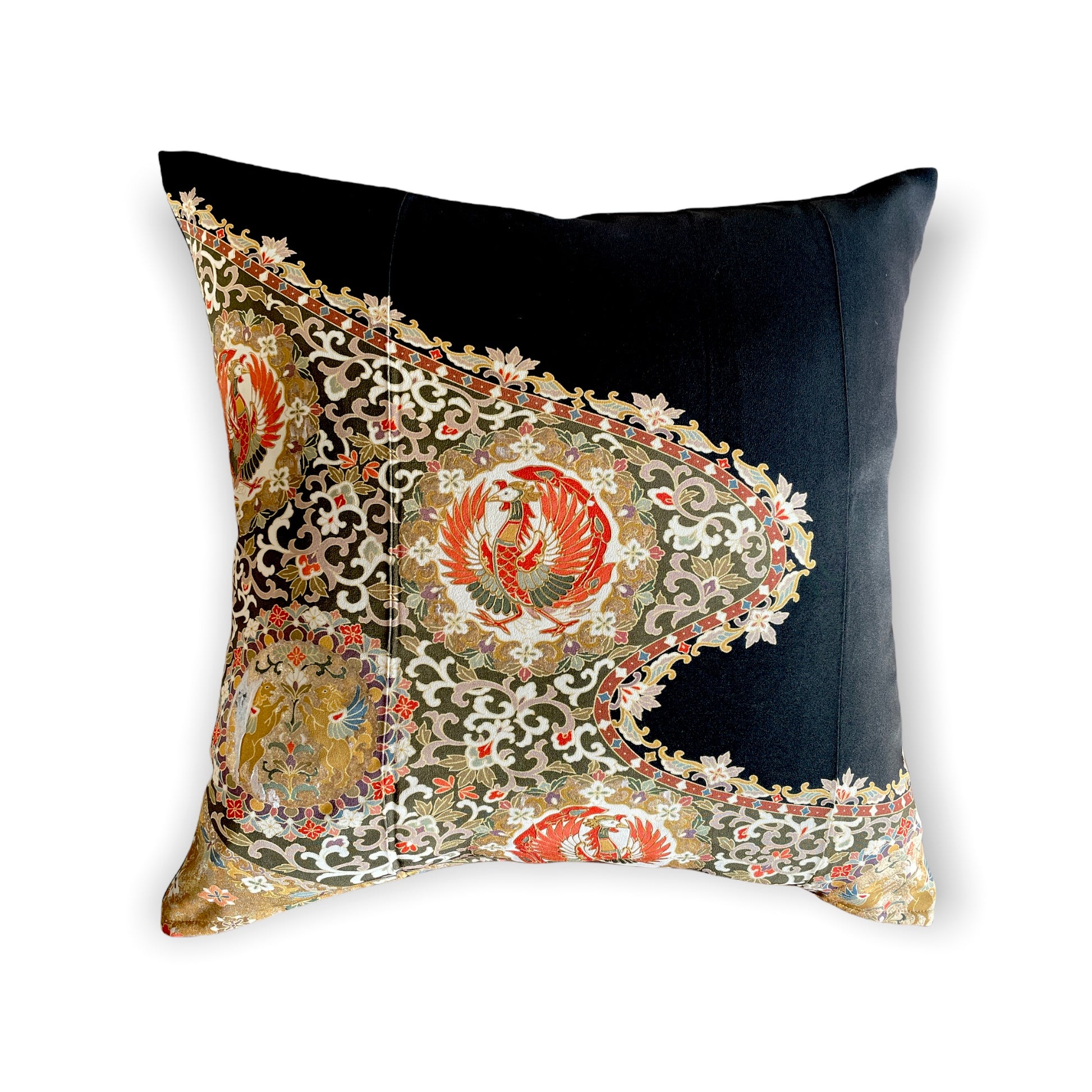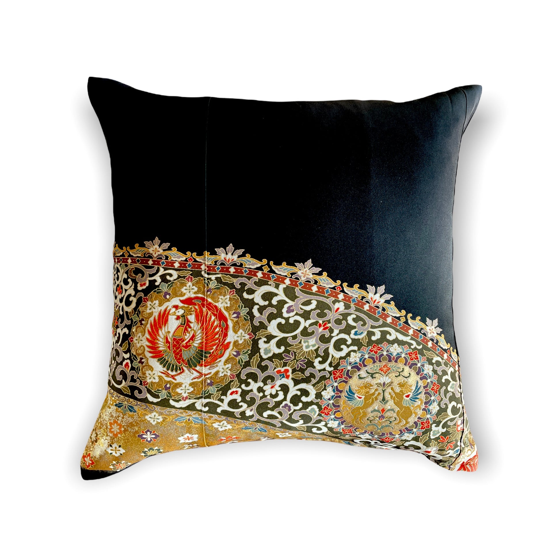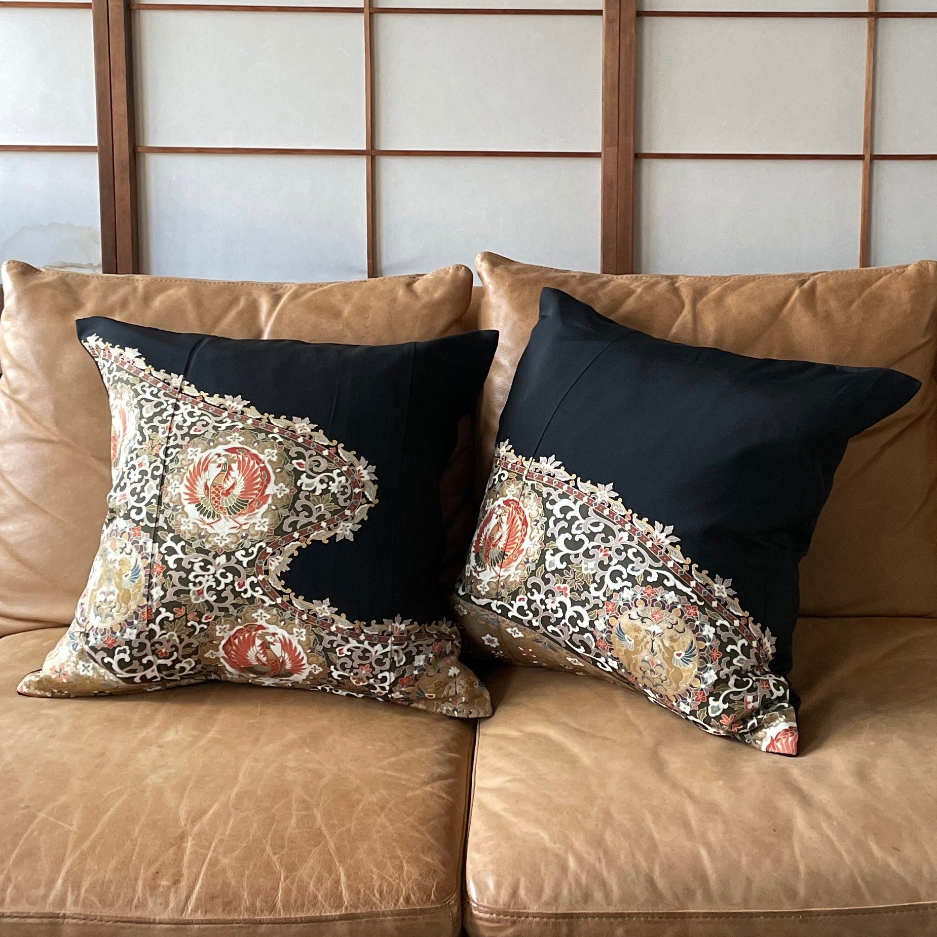 黒留【鳳凰、唐草】アンティーク クッション(2個/セット)